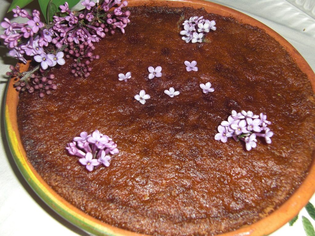 Αδειάζουμε το μείγμα σε ένα ταψάκι βουτυρωμένο διαμέτρου 20 – 22 εκατοστών, το απλώνουμε όμορφα με μια σπάτουλα και ψήνουμε σε προθερμασμένο φούρνο στους 180 βαθμούς 30 λεπτά περίπου μέχρι να ροδίσει καλά η επιφάνεια.