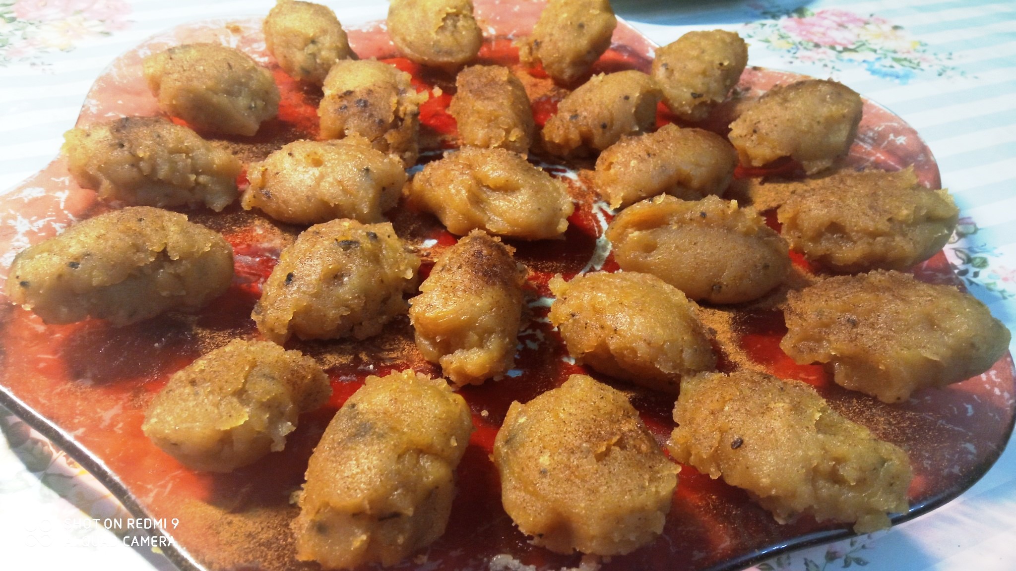 Παίρνω μια κουταλιά από το μείγμα και τη ρίχνω σε ένα πιάτο, σχηματίζοντας μικρά χαλβαδάκια.