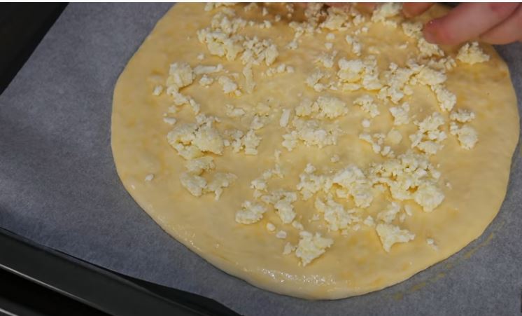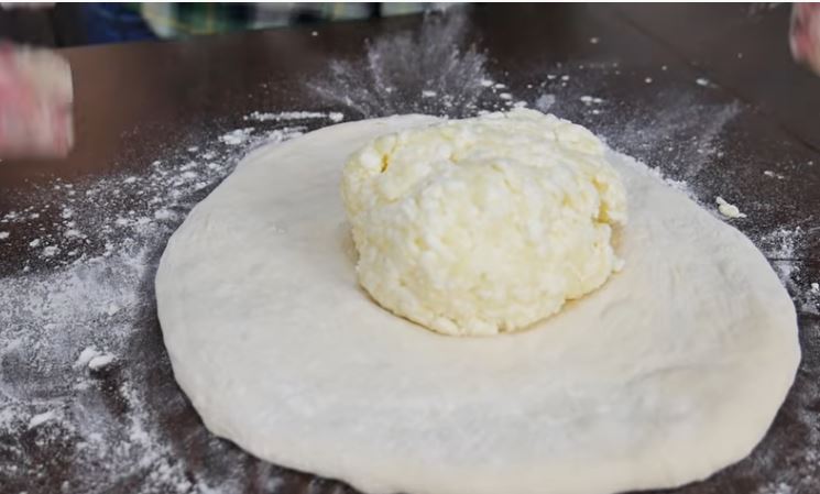 και μετα με τον πλάστη ανοίγουμε την γεμισμένη μπάλα μας απο τυρί σ ένα στρογγυλό φύλλο