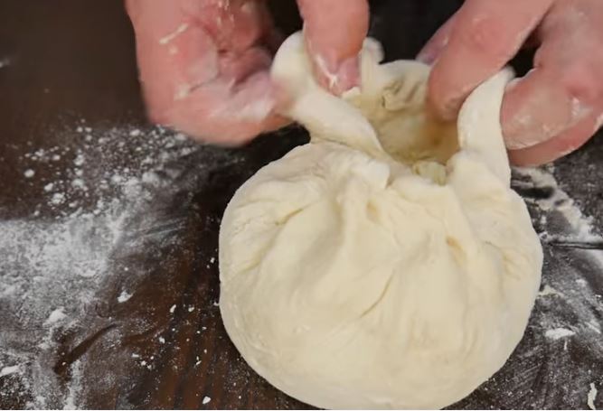 Τοποθετούμε την μια μπάλα τυριού στην μέση της ζύμης και κλείνουμε τη ζύμη μας πιάνοντας γύρω γύρω τις άκρες και τις ενώνουμε (σαν πουγκί) ώστε να κάνουμε πάλι μια μπάλα.