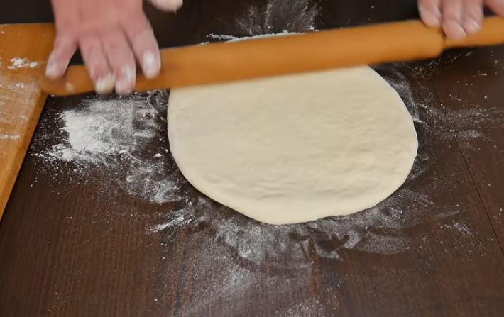 Ρίχνουμε λίγο αλεύρι στον πάγκο μας…παίρνουμε το ένα μέρος της ζύμης και το ανοίγουμε με τον πλάστη στο μέγεθος ενός πιάτου.