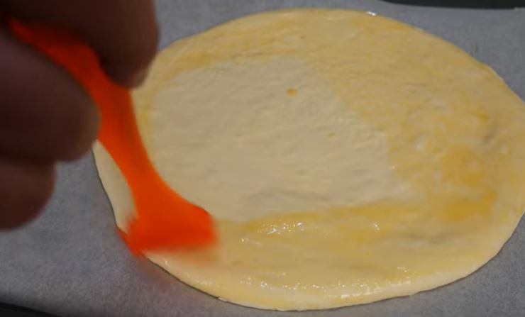 περίπου 25 εκ. Το αλείφουμε με το αυγό και ρίχνουμε από πάνω το τυρί που είχαμε κρατήσει.