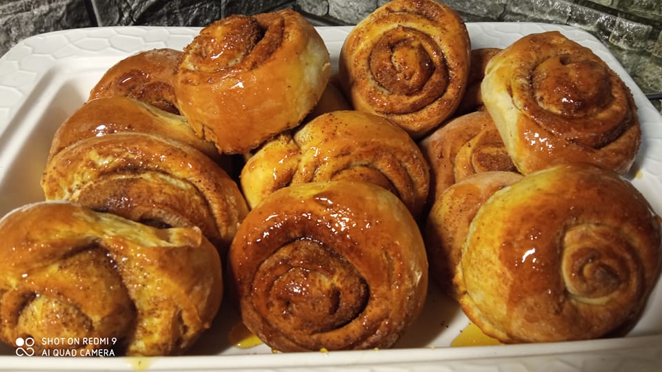Μόλις φουσκώσει η ζύμη, την ανοίγουμε σε ένα μεγάλο παραλληλόγραμμο. Πασπαλίζουμε με ένα μείγμα κανέλας και ζάχαρης.