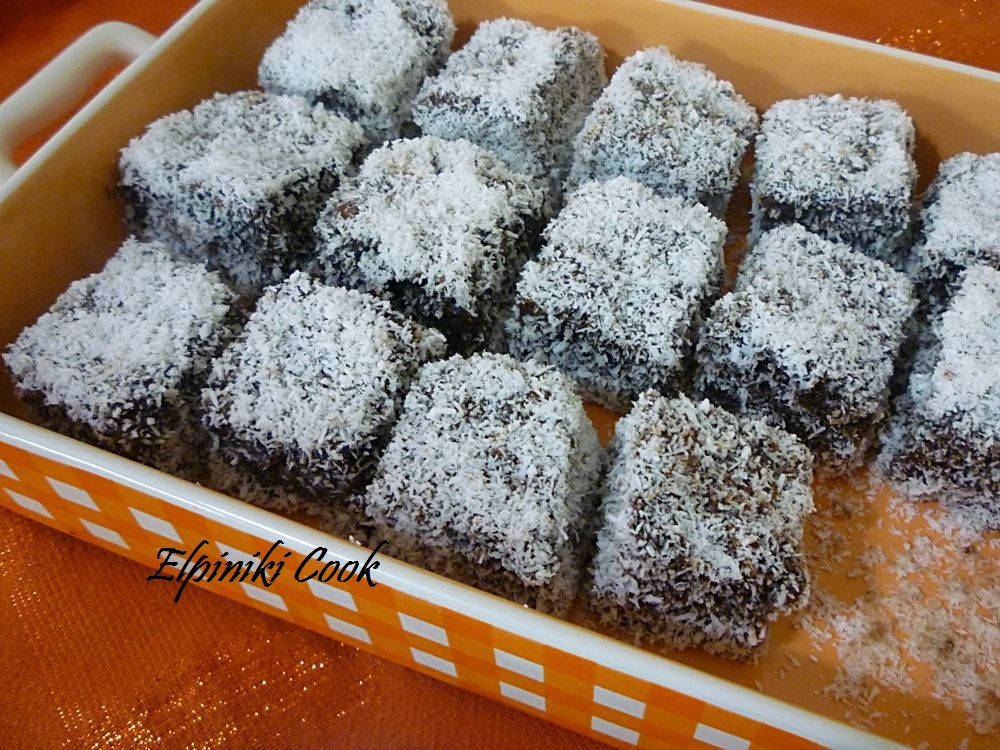 Βουτάμε τα κομμάτια στο σιρόπι, τ’ αφήνουμε για 1’ και αμέσως μετά στο ινδοκάρυδο και σε λαδόκολλα να κρυώσουν.