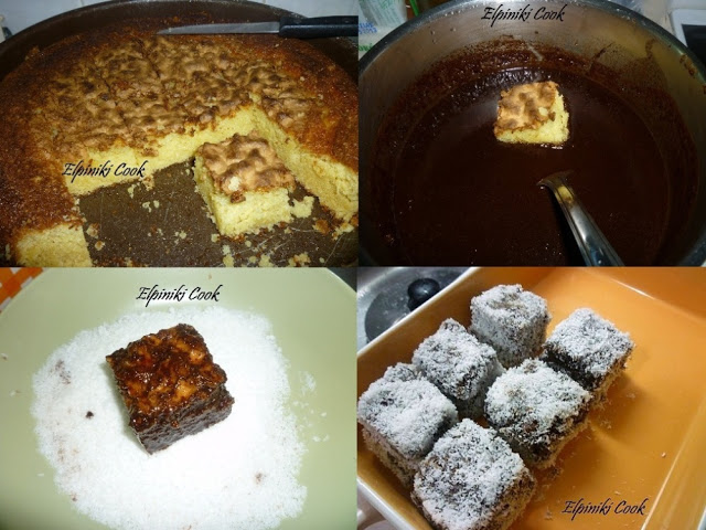 Κόβουμε το κέικ σε κομμάτια στο σχήμα που θέλουμε. Ή ορθογώνια κομμάτια ή τετράγωνα και μετά τρίγωνα. Το σιρόπι πρέπει να είναι χλιαρό.