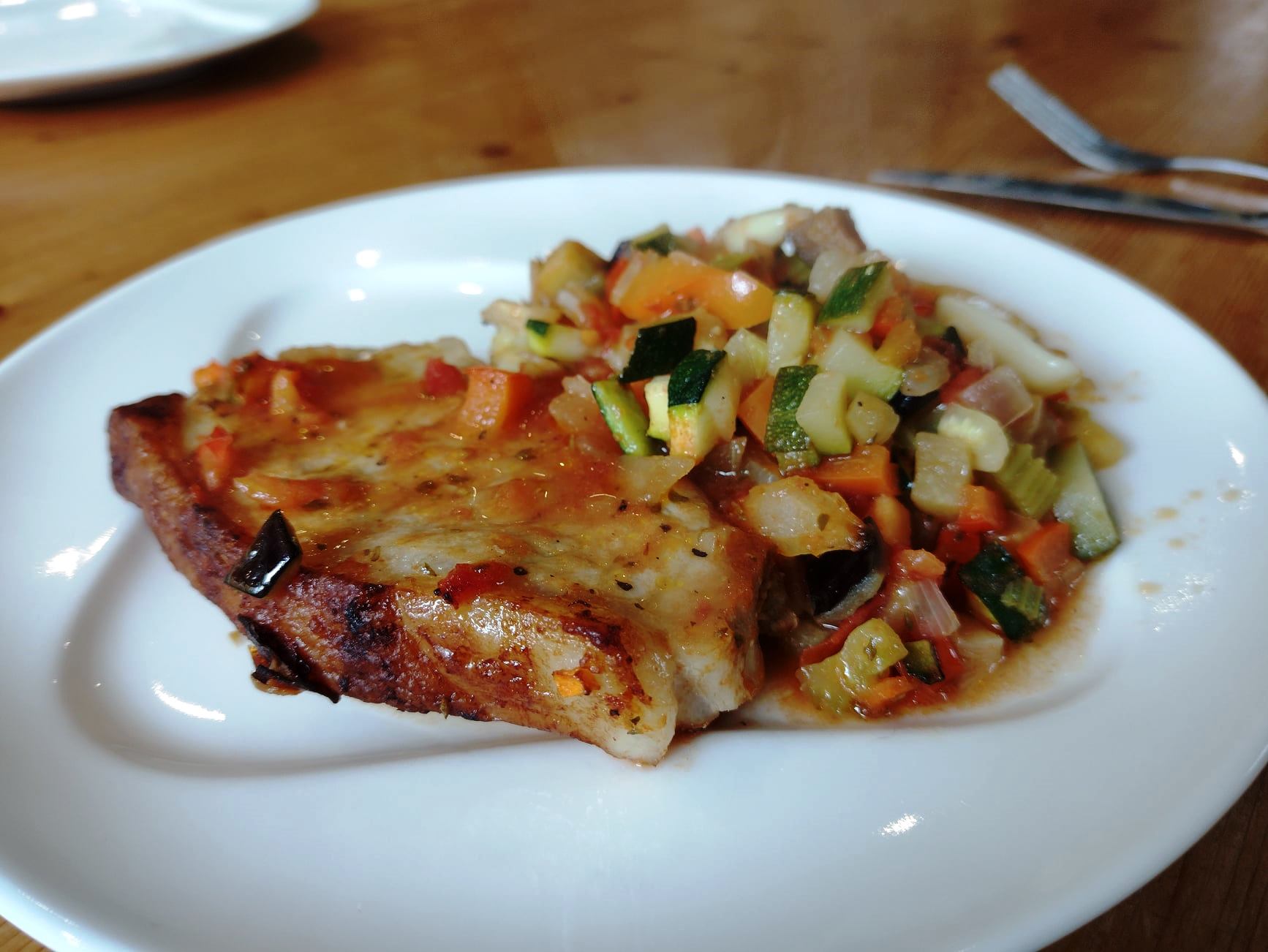 Τοποθετούμε τα 2/3 του μείγματος λαχανικών σε ένα ταψάκι μετά από πάνω τις μπριζόλες και τις καλύπτουμε με το υπόλοιπο 1/3 του μείγματος.