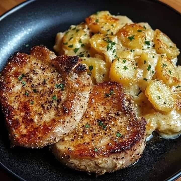 Ψήστε για 50 λεπτά ή μέχρι οι πατάτες να μαλακώσουν και οι χοιρινές μπριζόλες να φτάσουν τους 63°C εσωτερικά.