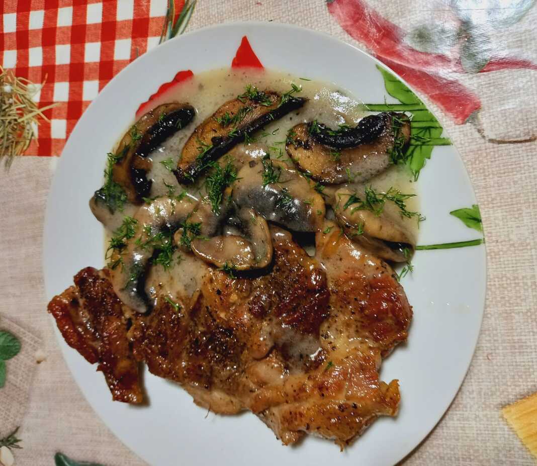 Ζεσταίνουμε το λάδι με το βουτυρο σε ένα τηγάνι από τεφλόν και τηγανίζουμε τις μπριζόλες και από τις δύο πλευρές μέχρι ναροδίσουν. Ρίχνουμε λίγο νερό και σιγοβράζουμε σε χαμηλή φωτιά. Βγάζουμε τις μπριζόλες από το τηγάνι και σιγοβράζουμε τα φρεσκοκομμένα φρέσκα μανιτάρια στο ίδιο λάδι για περίπου 10 λεπτά. Στη συνέχεια, το αλεύρι διαλύεται σε 150 ml χλιαρό νερό για να γίνει μια πάστα, προστίθεται στο τηγάνι και ανακατεύεται συνεχώς.