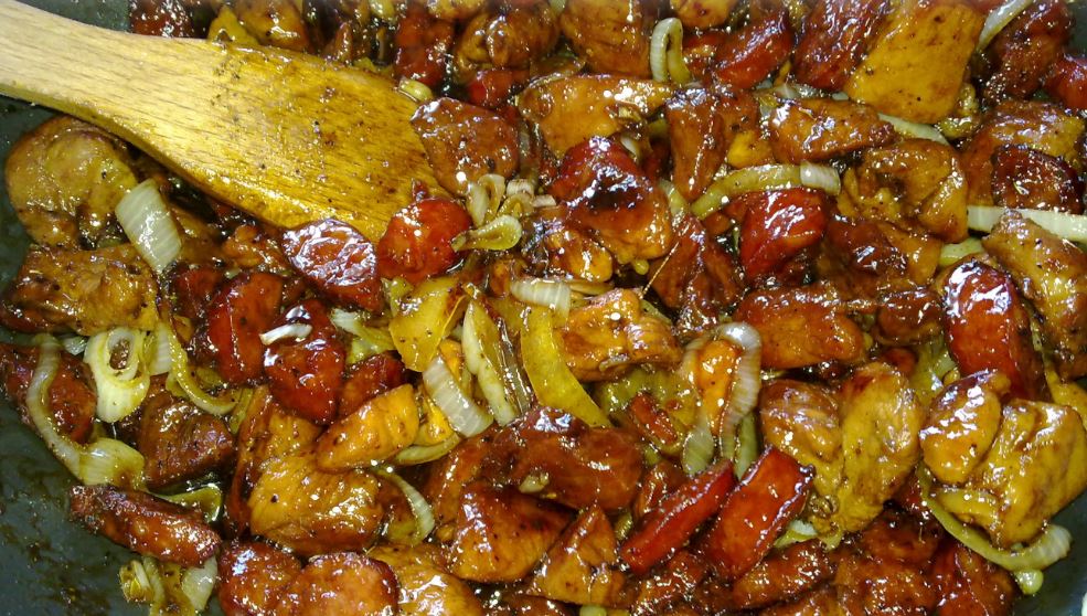 Ανακατεύουμε..Προσθέτουμε τις ροδέλες του κρεμμυδιού. Η τηγανιά έχει καραμελώσει και είναι έτοιμη.