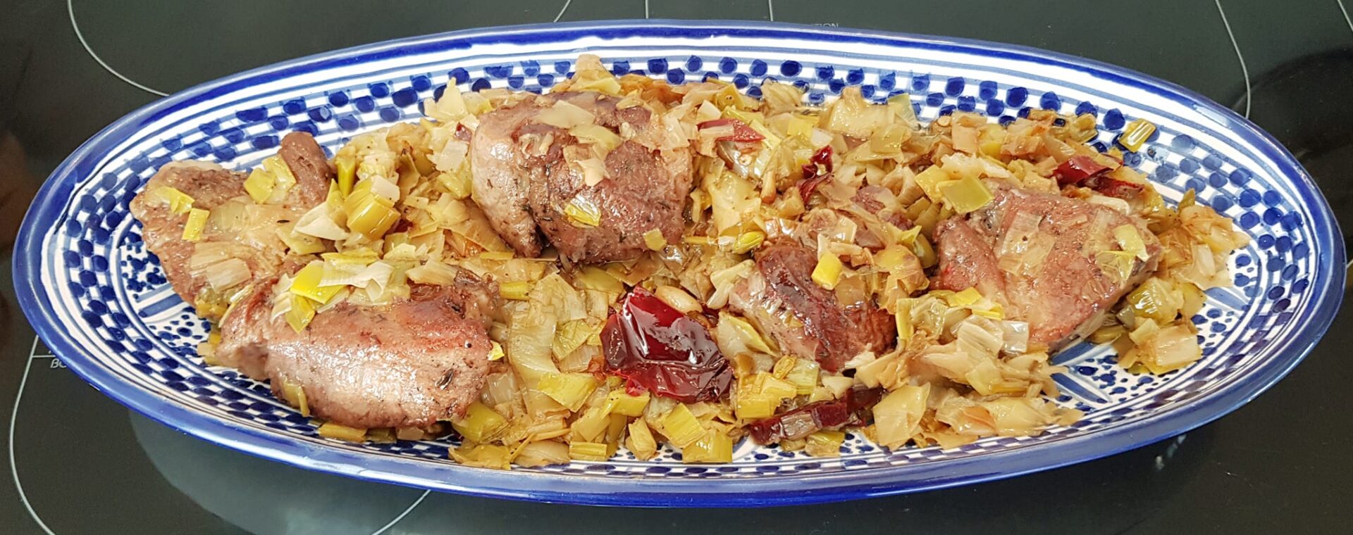 Χοιρινός λαιμός με πράσο και αποξηραμένες κόκκινες πιπεριές