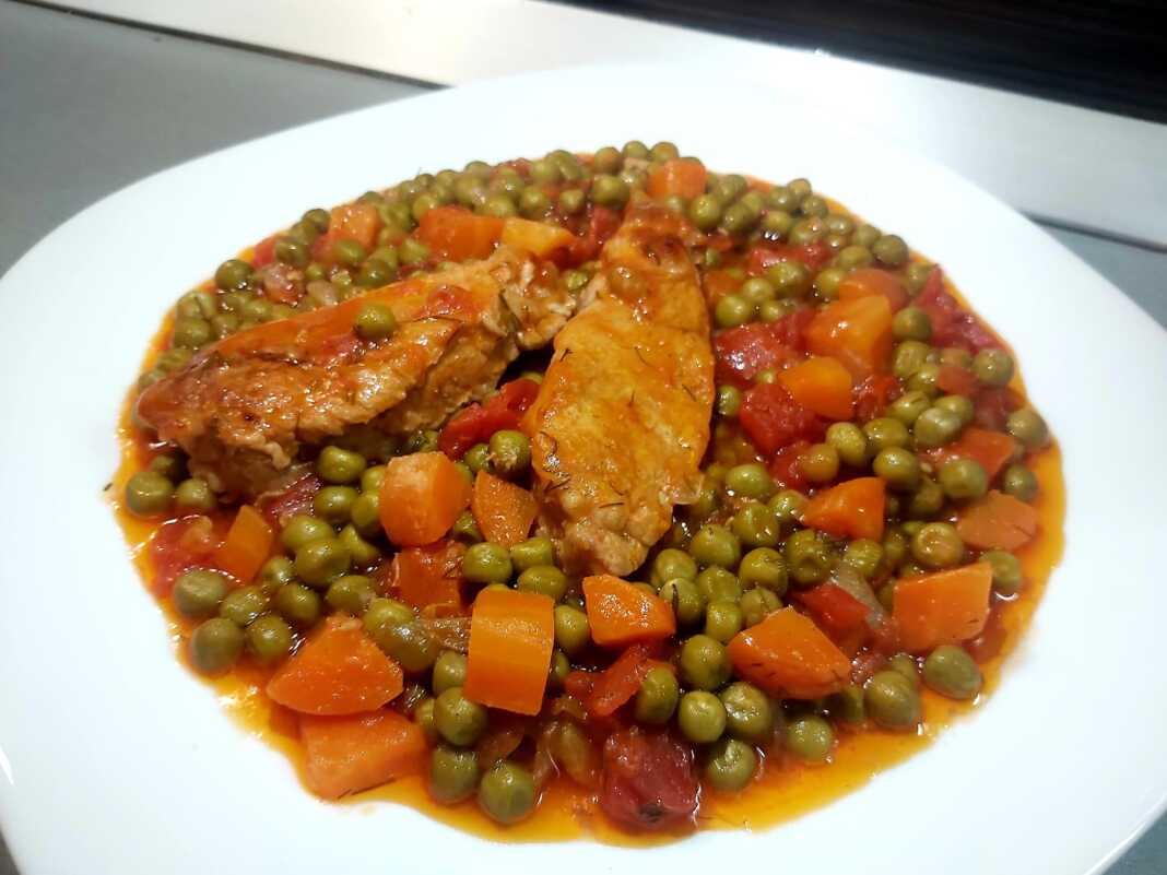 Προσθέστε τον αρακά, ρίξτε βραστό νερό στο επίπεδο του κρέατος.