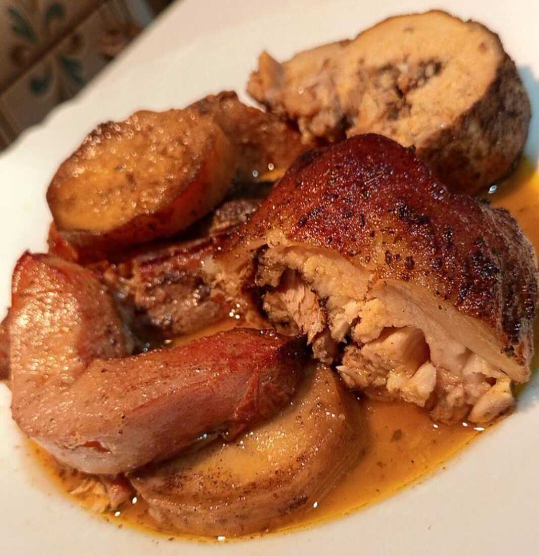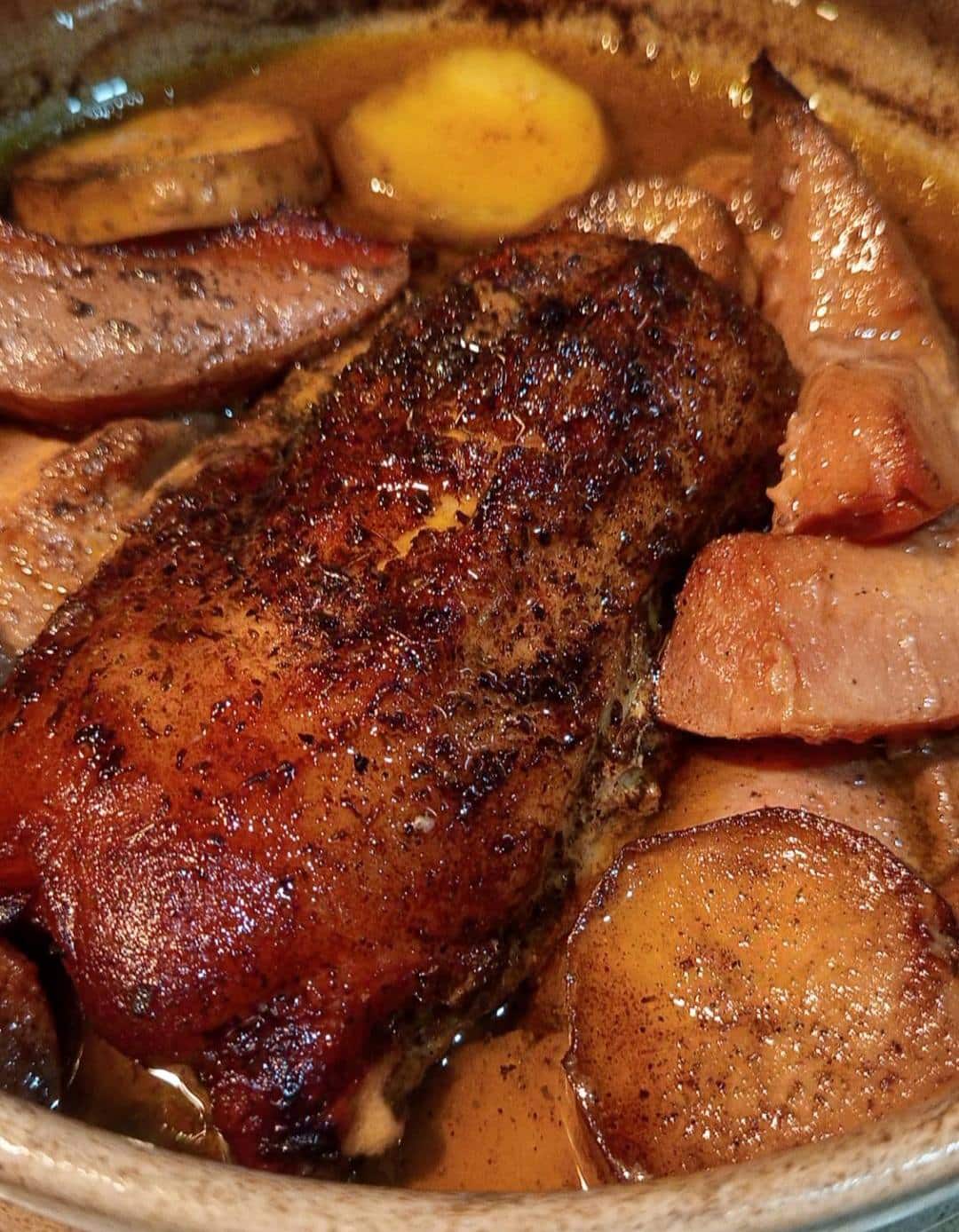 ( μισό -μισό). Σκεπάζω τη γάστρα και ψήνω στους 180 β.αέρα για 2 ώρες περίπου, ξεσκεπάζω και ψήνω άλλα πέντε λεπτά να πάρει η πετσούλα το χρώμα που μας αρέσει ..