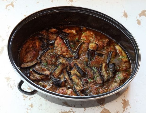 Προσθέτουμε στη γάστρα τις μελιτζάνες και μαγειρεύουμε για μισή ώρα ακόμη με το καπάκι κλειστό. Το σερβίρουμε στην πιατέλα με πατάτες τηγανητές και φέτα.