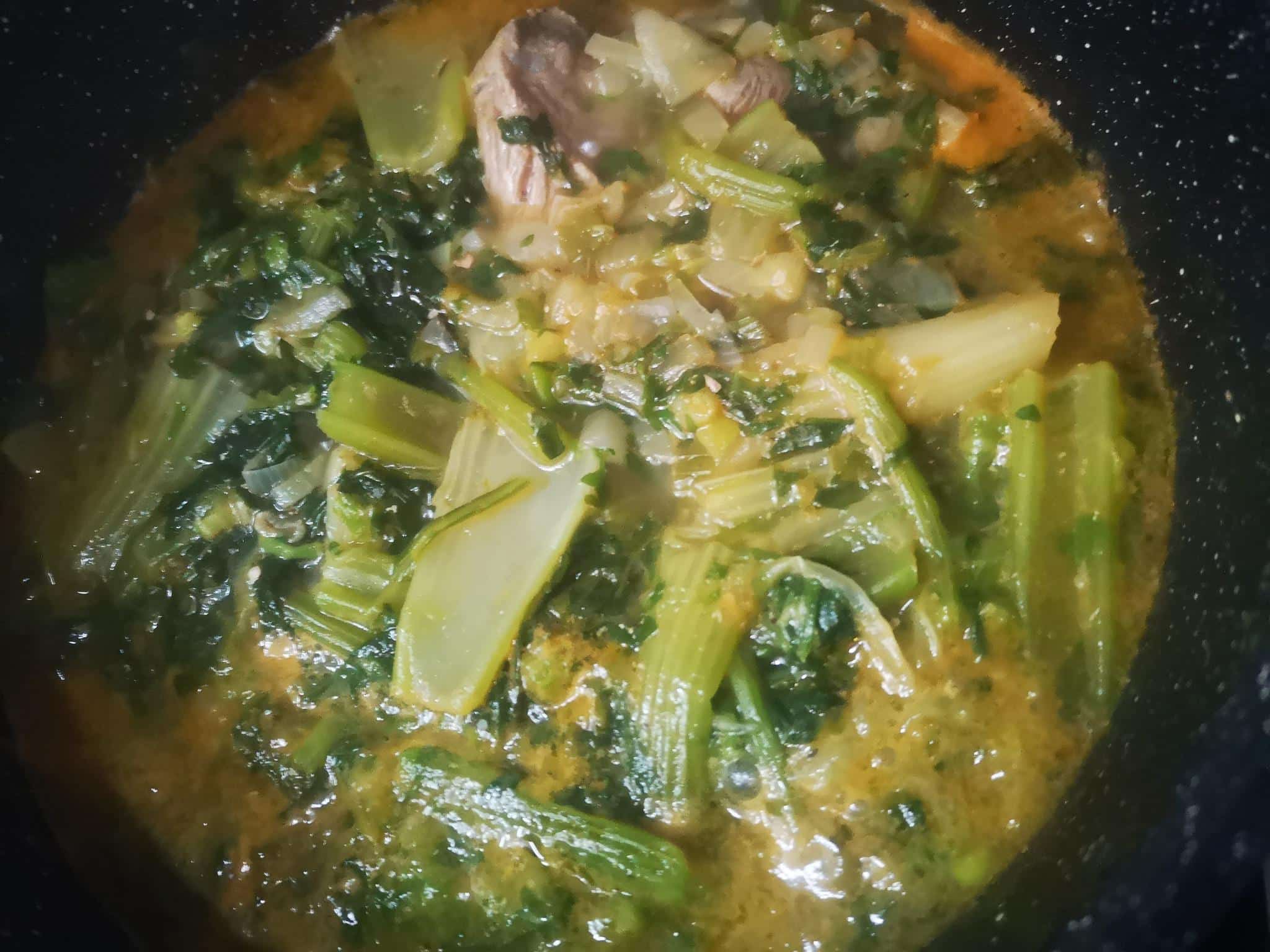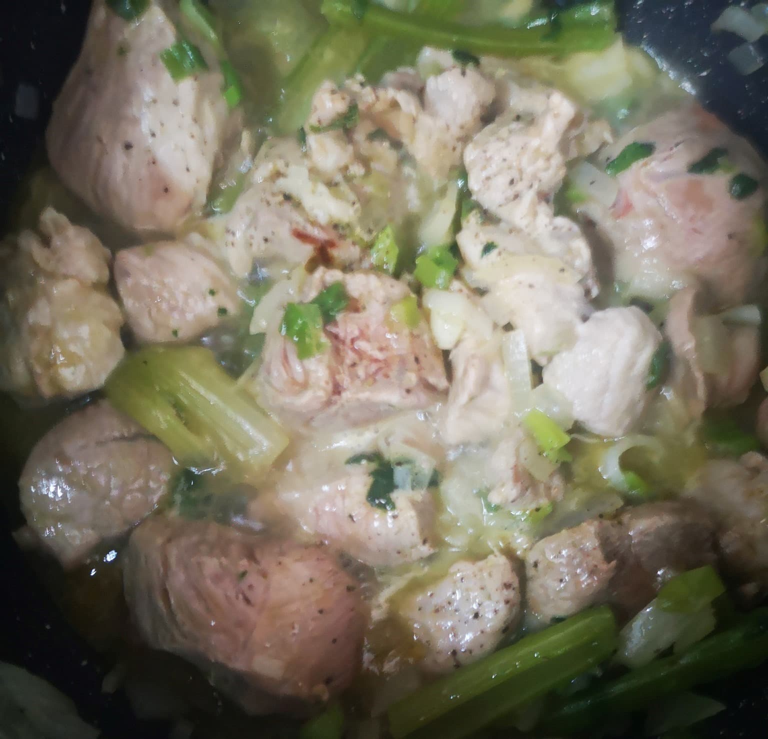 Ενώ βράζει το κρέας καθαρίζουμε και κόβουμε το σέλινο σε κομμάτια των 5 εκ Το ζεματάμε για 5 λεπτά σε νερό και το στραγγίζουμε. Μόλις το κρέας μαλακώσει αρκετά προσθέτουμε το σέλινο και τα φρέσκα κρεμμυδάκια.