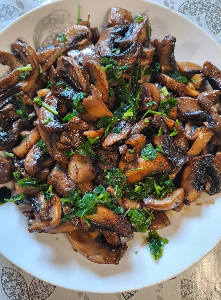 Σοτάρω μανιτάρια σε ένα τηγάνι.
