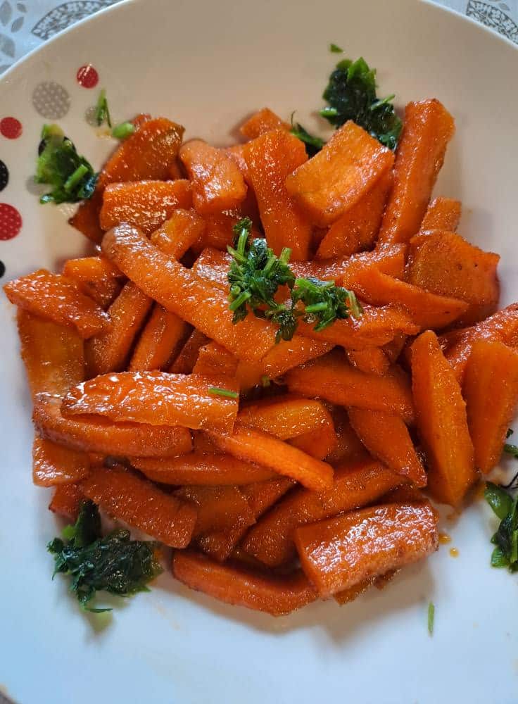 Καθαρίζετε καλά 750 γρ. τρυφερά καρότα, τα κόβετε κατά μήκος στη μέση και στη συνέχεια σε μεγαλούτσικες λοξές φέτες, όσο γίνεται με ίδιο μέγεθος όλες. Τις ρίχνετε σε μια φαρδιά και ρηχή κατσαρόλα, προσθέτετε 1 φλιτζάνι νερό ή όσο πρέπει για να καλυφθούν τελείως (αλλά όχι μπλουμ!), 1 κουταλιά ζάχαρη, κατά προτίμηση καστανή, 2 κουταλιές αγελαδινό βούτυρο και λίγο αλάτι. Τα αφήνετε να πάρουν μια βράση σε δυνατή φωτιά, σκεπάζετε την κατσαρόλα, αφήνοντας ένα ελάχιστο άνοιγμα να βγαίνει ο ατμός, και τα βράζετε για 12 – 14 λεπτά, μέχρι να μαλακώσουν αλλά να μην κομματιάζονται. Ξεσκεπάζετε την κατσαρόλα και συνεχίζετε το μαγείρεμα, μέχρι να σωθούν όλα τα υγρά. ΔΕΝ ΑΝΑΚΑΤΕΥΕΤΕ ΚΑΘΟΛΟΥ, απλώς ανακινείτε τακτικά την κατσαρόλα. Νοστιμίζετε με λίγο αλατοπίπερο και προσθέτετε 2 κουταλιές πολύ ψιλοκομμένο μαϊντανό. Ανακατεύετε πολύ απαλά και σερβίρετε αμέσως.