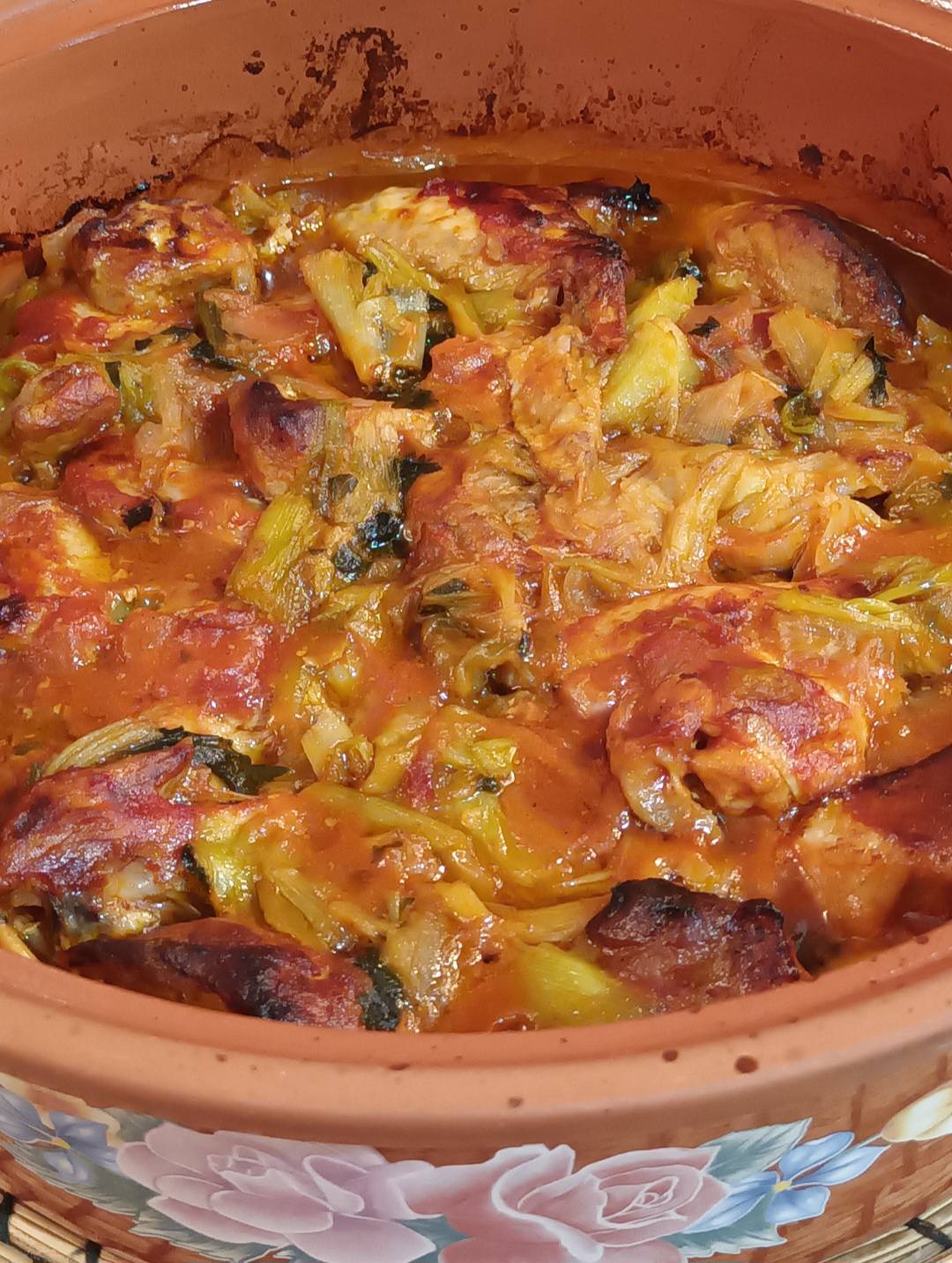 Όταν το κρέας είναι έτοιμο, ρίχνω στο πήλινο τα στραγγισμένα πράσα και το σέλινο και πάνω τους τοποθετώ το κρέας με όλη του την σάλτσα. Προσθέτω και το υπόλοιπο ελαιόλαδο, διορθώνω στο αλάτι και πιπέρι, σκεπάζω τη γάστρα και την βάζω στο φούρνο στους 200 βαθμούς 1 ώρα περίπου. 15λ προς το τέλος, ξεσκεπάζω τη γάστρα, για να ροδίσει το φαγητό μου ομοιόμορφα.