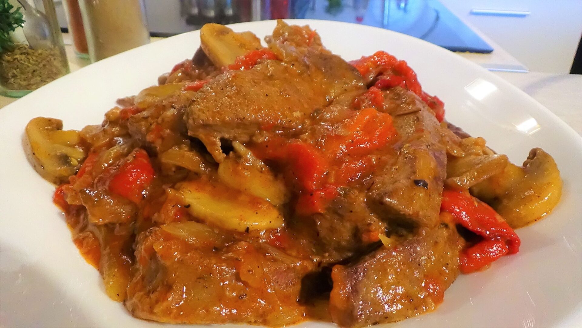 μέχρι να αρχίσουν να μαλακώνουν. Προσθέτουμε τις ντομάτες, τις ψητές πιπεριές, το κόκκινο κρασί, 100 ml. νερό και χοιρινό συκώτι.