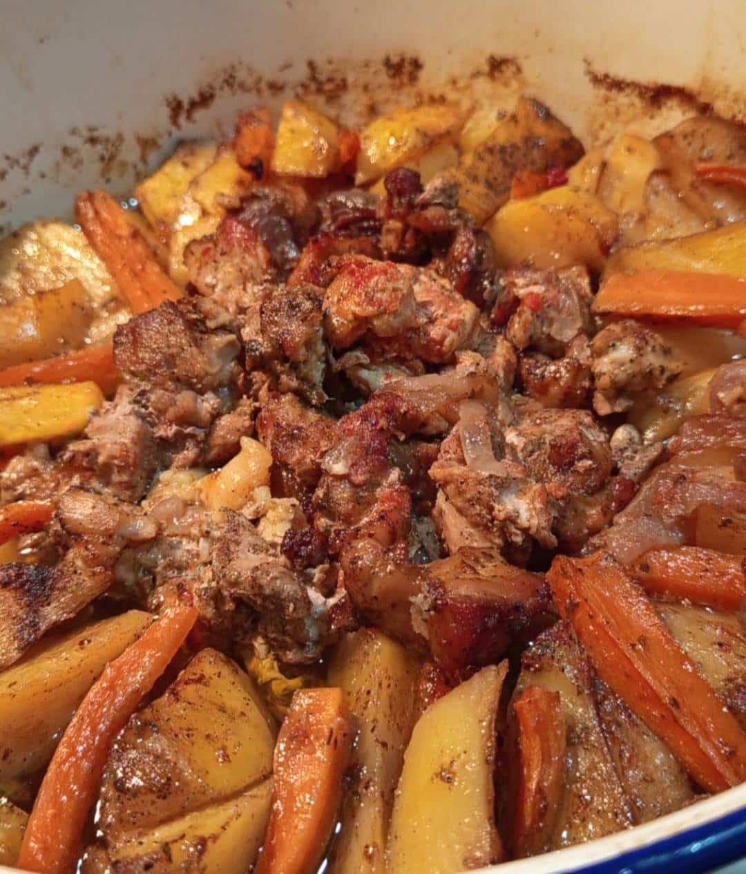 Σκεπάζω τη γάστρα και ψήνω στους 200 βαθμούς αέρα για 45-50 λεπτά, ξεσκέπασα κι έψησα άλλα 15′ να πάρουν χρώμα.