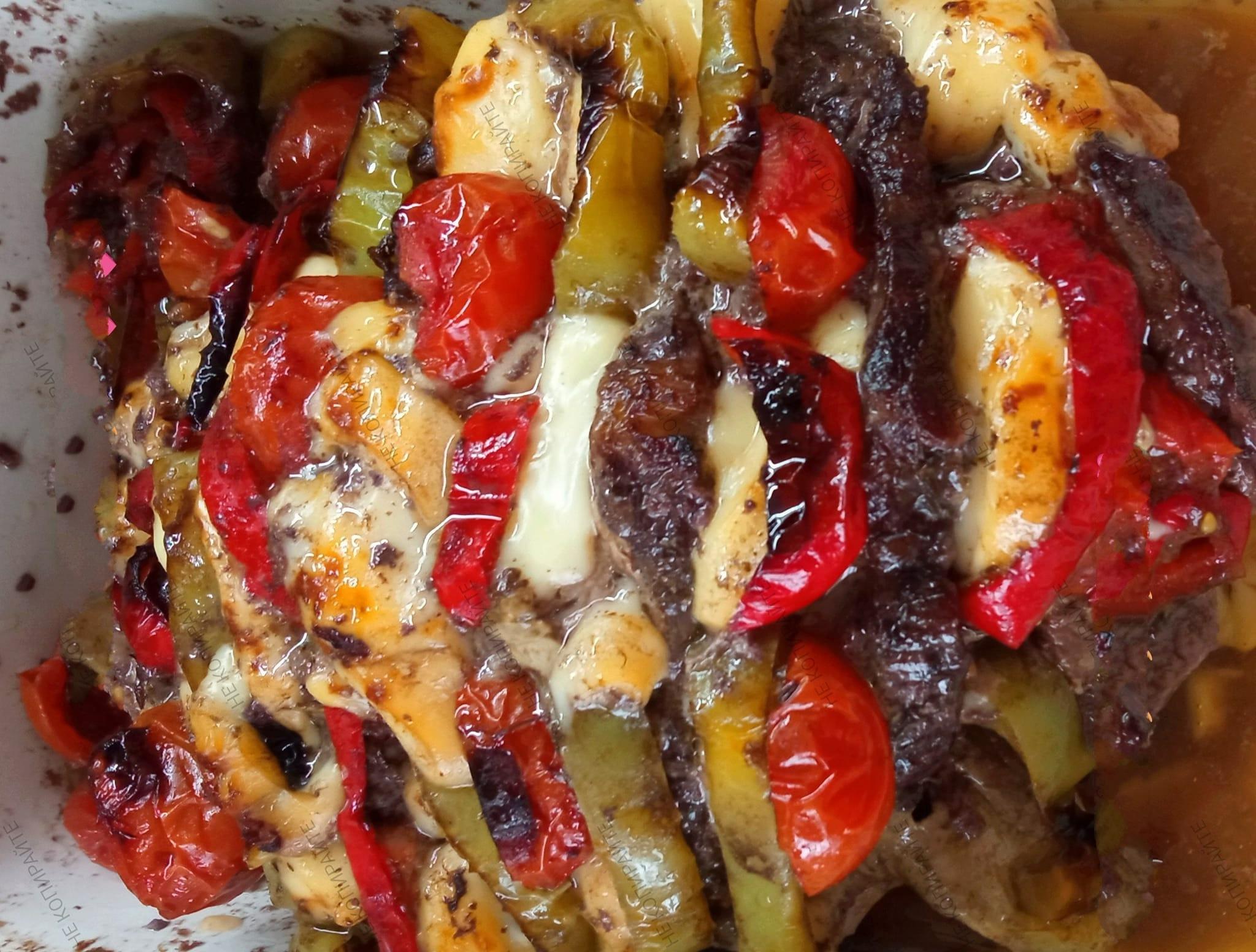 Χοιρινo με καπνιστό τυρί, ντομάτες και πιπεριές