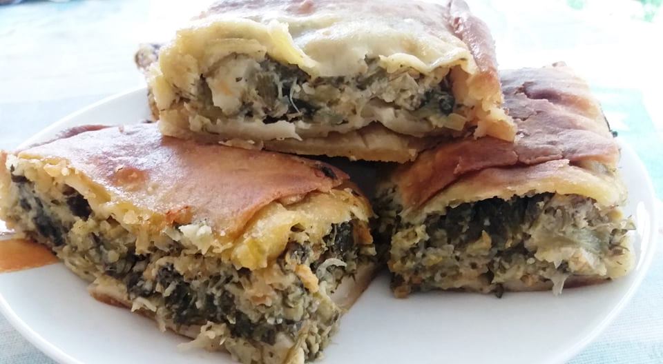 Αποσύρουμε από τη φωτιά και αφήνουμε να κρυώσει. Σ ένα μπολ χοντροκόβουμε τη φέτα προσθέτουμε τα αβγά ελαφρώς χτυπημένα και ανακατεύουμε. Ρίχνουμε πιπέρι και προσθέτουμε το μίγμα στην κατσαρόλα.Ανακατεύουμε. η γέμιση είναι έτοιμη να την βάλουμε στο ταψί.