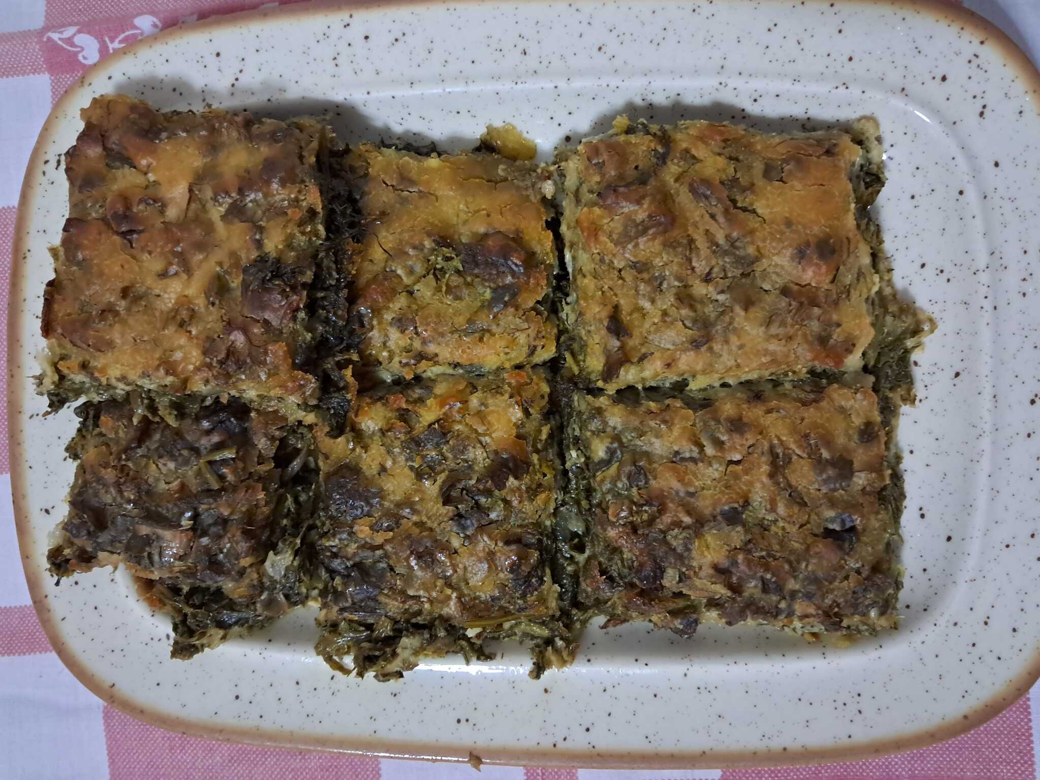Βάζουμε από πάνω το μίγμα με τα χόρτα και στο τέλος πάνω πάνω τον υπόλοιπο χυλό.