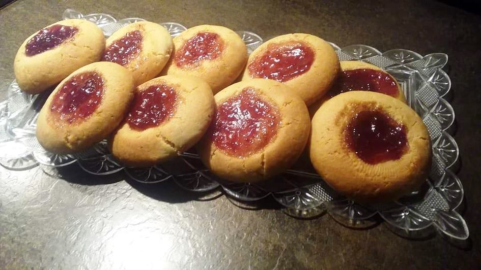 Αδειάζουμε τη μαρμελάδα σε μία σακούλα ζαχαροπλαστικής και γεμίζουμε τα βαθουλώματα των μπισκότων με αυτή.