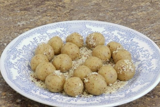 Πλάσιμο: Ρίχνουμε τα ψίχουλα των ξηρών καρπών που κρατήσαμε στην άκρη σε ένα πιάτο. Πλάθουμε τη ζύμη σε μικρές μπάλες (περίπου στο μέγεθος καρυδιού). Κυλάμε τα μπισκότα στα ψίχουλα ξηρών καρπών για να καλυφθούν περιμετρικά.