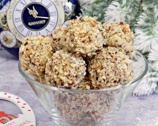Πλάσιμο: Ρίχνουμε τα ψίχουλα των ξηρών καρπών που κρατήσαμε στην άκρη σε ένα πιάτο. Πλάθουμε τη ζύμη σε μικρές μπάλες (περίπου στο μέγεθος καρυδιού). Κυλάμε τα μπισκότα στα ψίχουλα ξηρών καρπών για να καλυφθούν περιμετρικά.