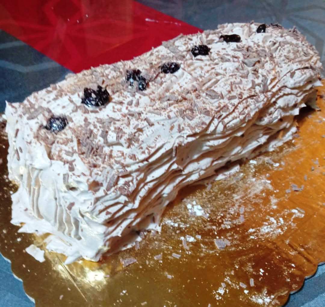 Στη σαντιγύ που έμεινε έριξα δύο κουταλιές μερέντα χτύπησα για ένα λεπτό και άρχισα να βαζω πάνω στον κορμό μου με ένα πιρούνι έκανα τις ραβδώσεις επάνω στον κορμό έβαλα λίγα βύσσινα έριξα λίγη τριμμένη σοκολάτα και είναι έτοιμος για να παγώσει
