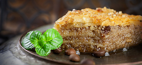 Συνεχίζετε με φύλλο-γέμιση έως ότου τελειώσουν. Φροντίζετε πάνω-πάνω να κρατήσετε 3 φύλλα κρούστας χωρίς γέμιση. Κόβετε το γλυκό σε κομμάτια και σε κάθε κομμάτι καρφώνετε ένα γαρύφαλλο.