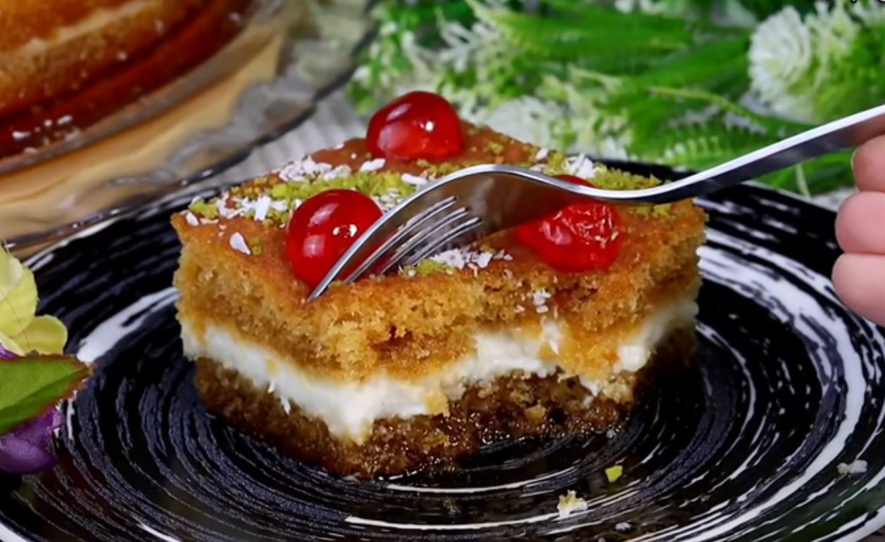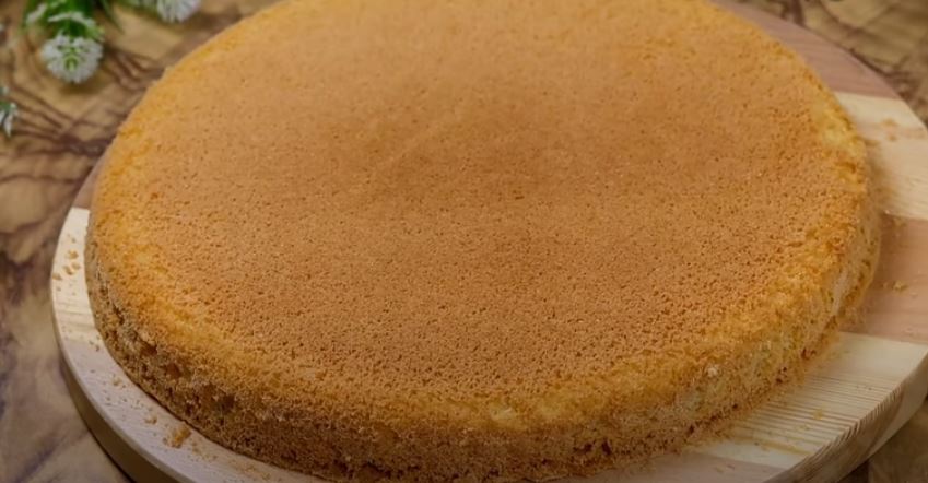 Βγάζουμε από το φούρνο αφαιρούμε το κέικ απο το πυρέξ και το κόβουμε οριζόντια στα 2 ισα μέρη.