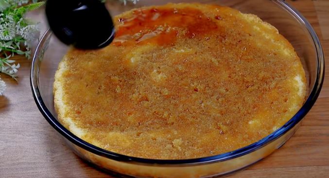 Στο στρόγγυλο πυρέξ βάζουμε το κέικ και το ποτίζουμε με σιρόπι καλά.