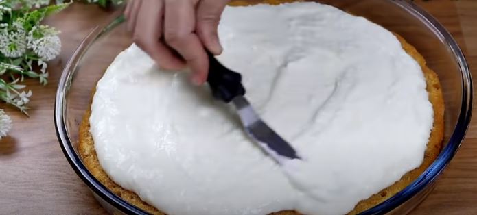 Βγάζουμε την κρεμα την χτυπάμε με ένα σύρμα και την απλώνουμε πάνω από την βάση.