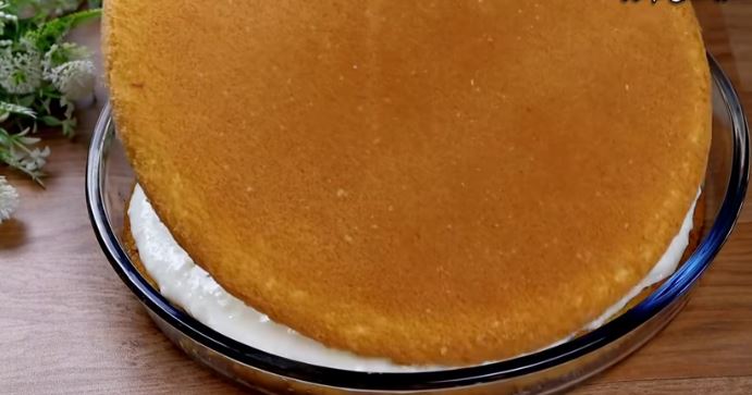 Βάζουμε απο πάνω το άλλο μισό κέικ και το ποτίζουμε με το υπόλοιπο κέικ.