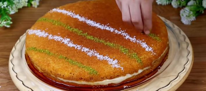 Το γυρίζουμε πάνω σε μία πιατέλα διακοσμούμε με καρύδα και τριμένο φυστικι αιγίνης ή καρύδι