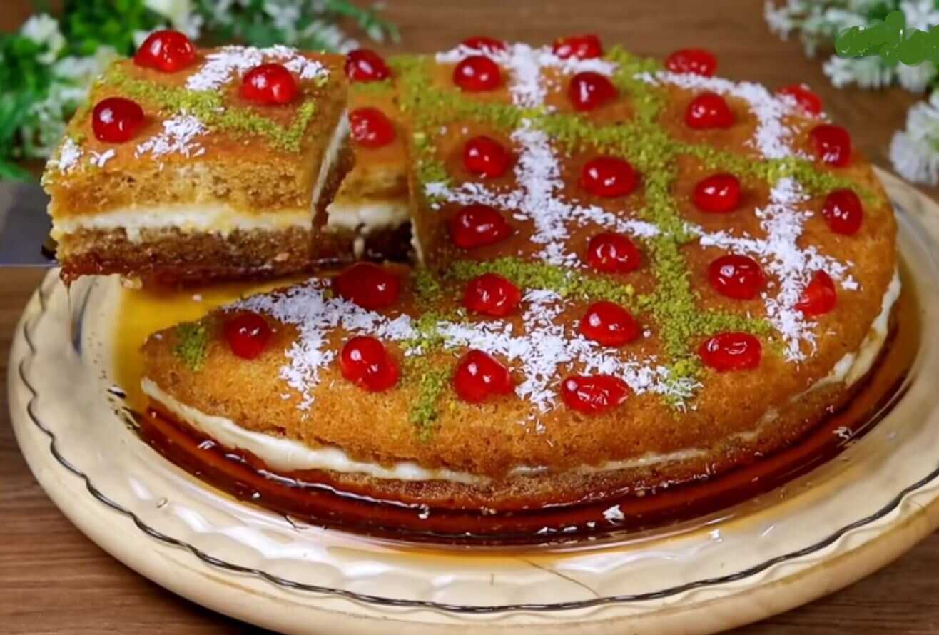 Βγάζουμε από το φούρνο αφαιρούμε το κέικ απο το πυρέξ και το κόβουμε οριζόντια στα 2 ισα μέρη.