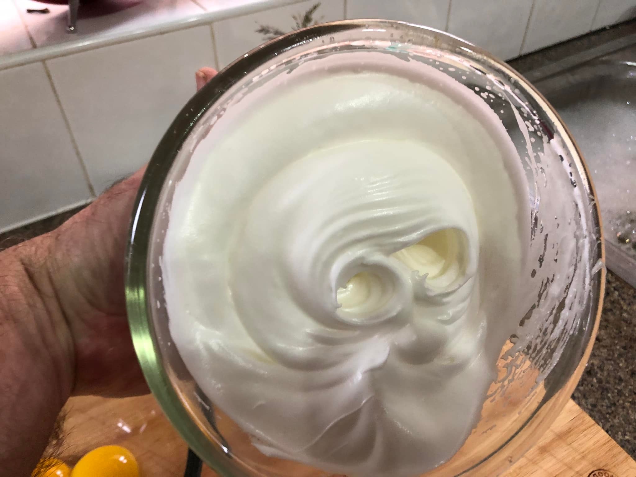 Τωρα το μόνο που μας μένει είναι να δουλέψουμε απαλά τα χτυπημένα ασπράδια στο μείγμα μασκαρπόνε…….