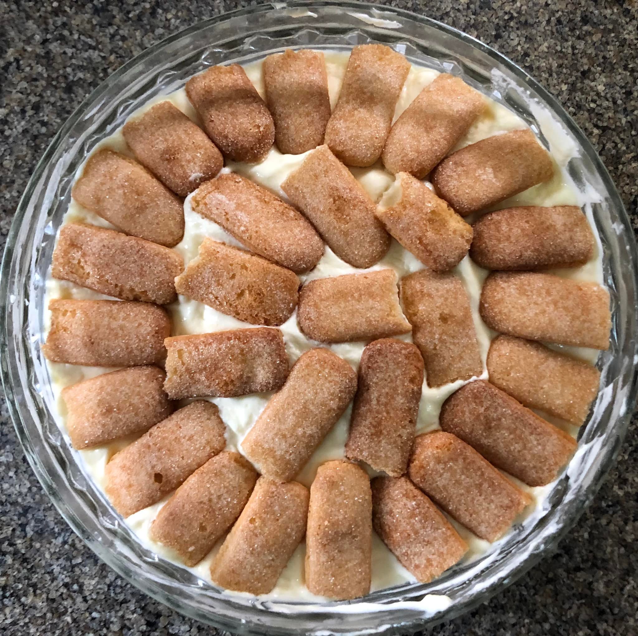 Στη συνέχεια, τοποθετήστε τα στο ταψί του γλυκού κρατώντας τη ζαχαρένια πλευρά προς τα πάνω σε όποιο στυλ θέλετε πάνω από τη στρώση του μείγματος μασκαρπόνε….
