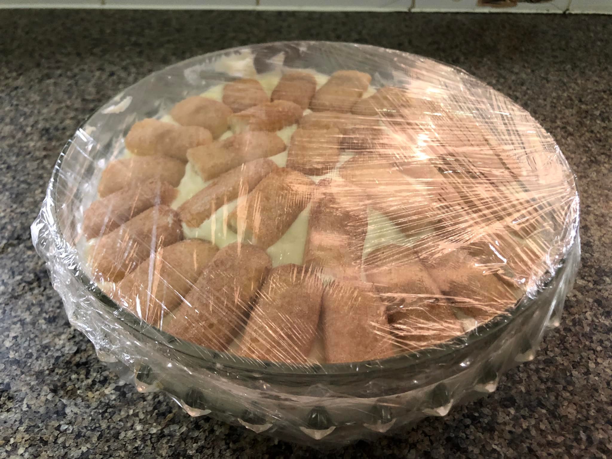 Τυλίξτε το γυάλινο σκεύος του γλυκού με μεμβράνη και στο ψυγείο για 2 έως 3 ώρες… αυτό επιτρέπει στο γλυκό να σφίξει👍