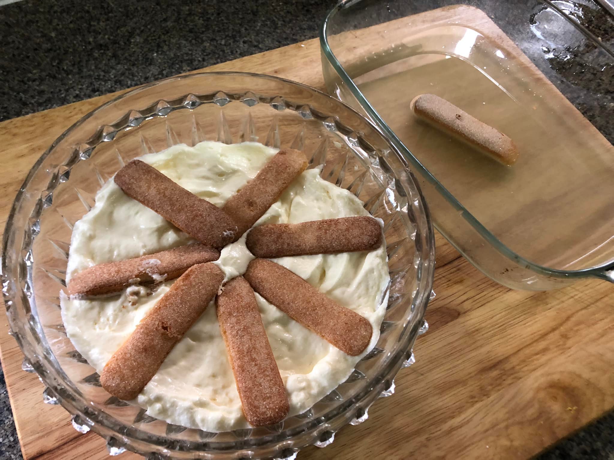 Ρίξτε μια άλλη στρώση με ένα κουτάλι από το μείγμα μασκαρπόνε καλύπτοντας τα εμποτισμένα με λεμόνι μπισκότα από κάτω……