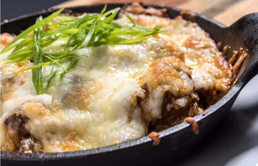 Τοποθετήστε το μείγμα κρεμμυδιού σε ένα μικρό πήλινο ή πυραντοχο μπολάκι. Τοποθετήστε τα τριμμένα τυριά πάνω από το μείγμα κρεμμυδιών και στη συνέχεια απλώστε το μαγειρεμένο λουκάνικο ​​πάνω από το τυρί.