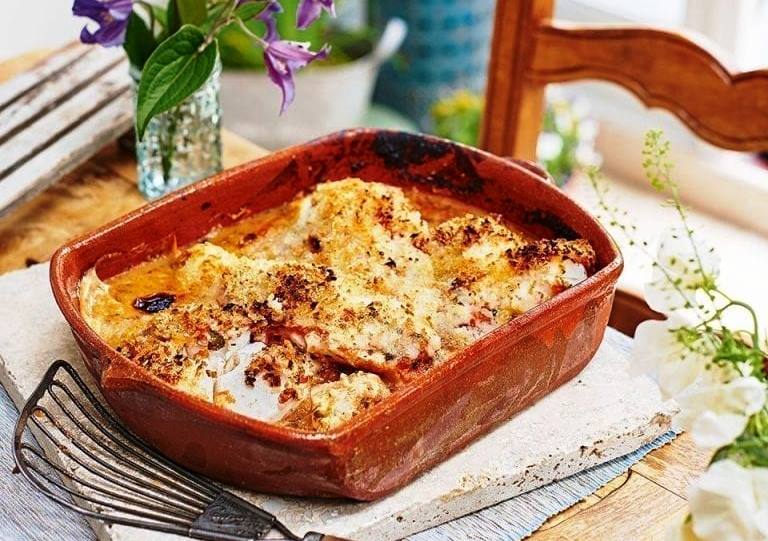 Ρίξτε στο ψάρι με λίγο περισσότερο αλάτι και πιπέρι. Ρίξτε ένα στρώμα από τη σάλτσα σε ένα ταψακι και στη συνέχεια τοποθετήστε τα ψάρια από πάνω. Ρίξτε την υπόλοιπη σάλτσα πάνω από το ψάρι. Πασπαλίστε πάνω την φρυγανιά και ψιλοβρέξτε με περισσότερο λάδι. Ψήστε για 20-25 λεπτά μέχρι να χρυσισισει από πάνω.