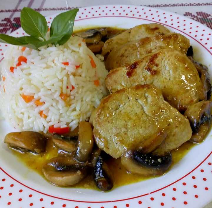 Ψαρονέφρι με λευκά μανιτάρια και πικάντικη σαλτσούλα 😋 συνοδεία με κίτρινο ρυζάκι καροτάκι και πιπεριά Φλωρίνης ψιλοκομμένα, αρωματισμένο με φρέσκο βούτυρο γάλακτος…😋😋