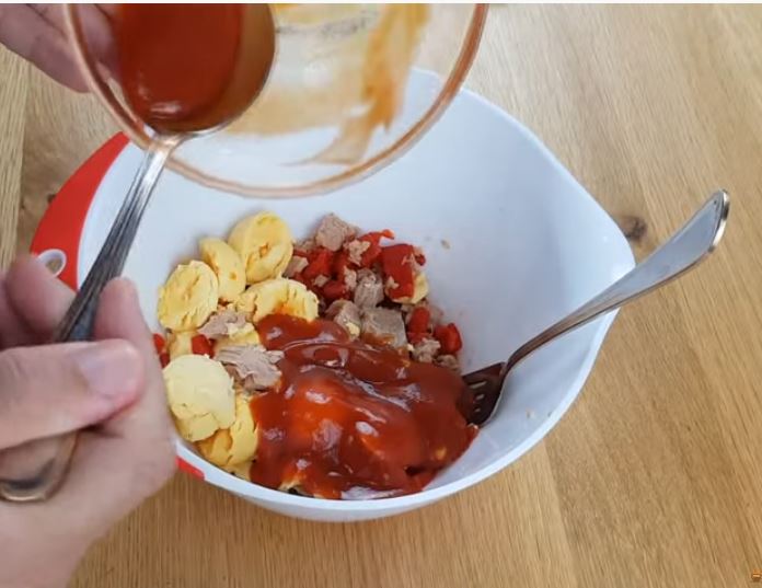 Σε ένα μπολ μικρο προσθέτουμε τον στραγγισμένο τόνο, την κοκκινη πιπερια και τους κρόκους των αυγών την σάλτσα ντομάτας.
