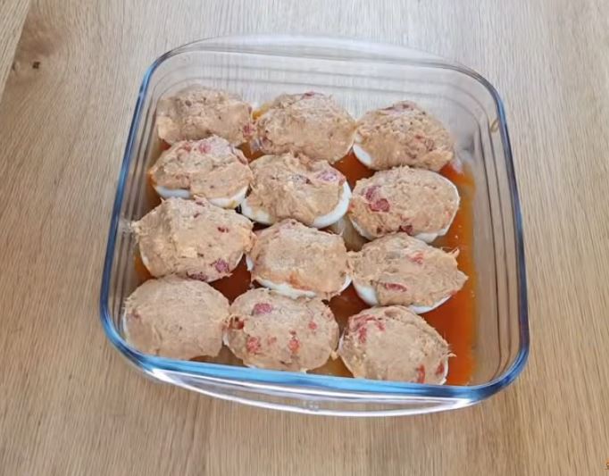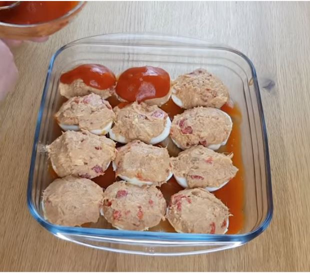 Σε ένα ταψί βάζουμε λίγο σάλτσα ντομάτας στο κάτω μέρος και τοποθετούμε τα γεμιστά αυγά.