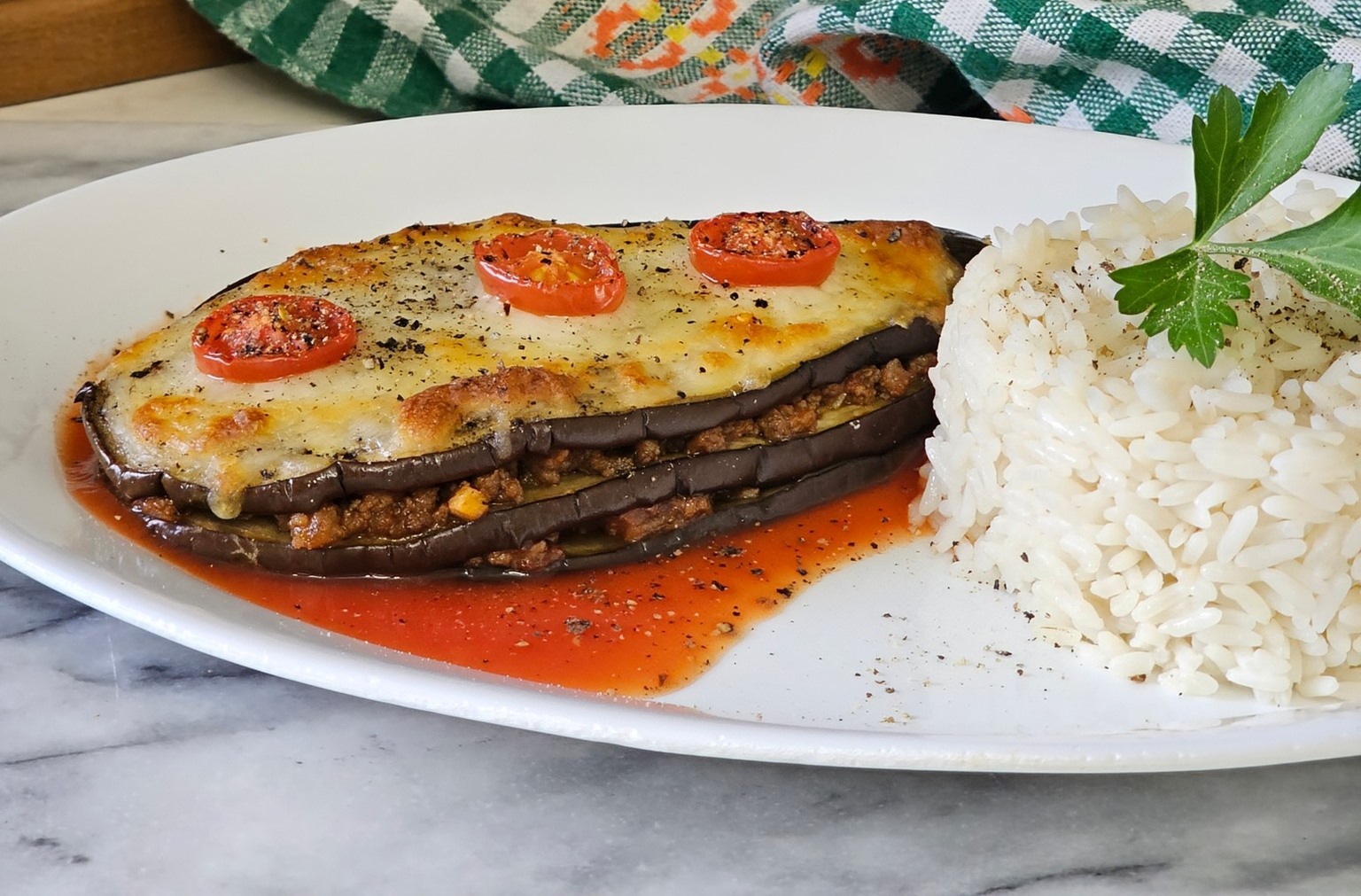 Βάζω άλλη μια φέτα μελιτζάνας, πάλι 2 κουταλιές σάλτσα κιμά, και τέλος μια τελευταία φέτα μελιτζάνας. Έτσι έχω “σάντουιτς” από μελιτζάνα-κιμά-μελιτζάνα-κιμά-μελιτζάνα.