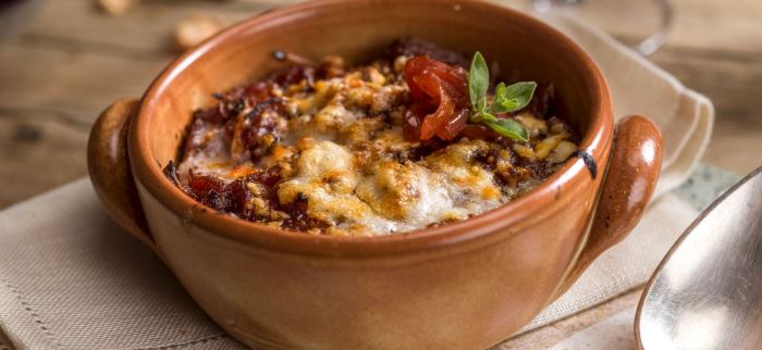 Τώρα πάρτε 4 κεραμεικά μπολάκια και γεμίστε με την σειρά: μια φέτα ψωμί, κύβους τυριού gouda, καραμελωμένα κρεμμύδια με ντομάτα και ένα πασπάλισμα με τυρί παρμεζάνας.