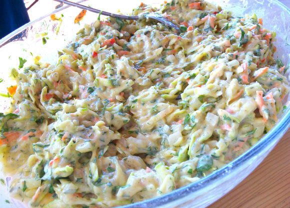 Τρίβετε τα κολοκυθάκια, τα καρότα και την πατάτα στον τρίφτη και τα βάζετε σε ένα