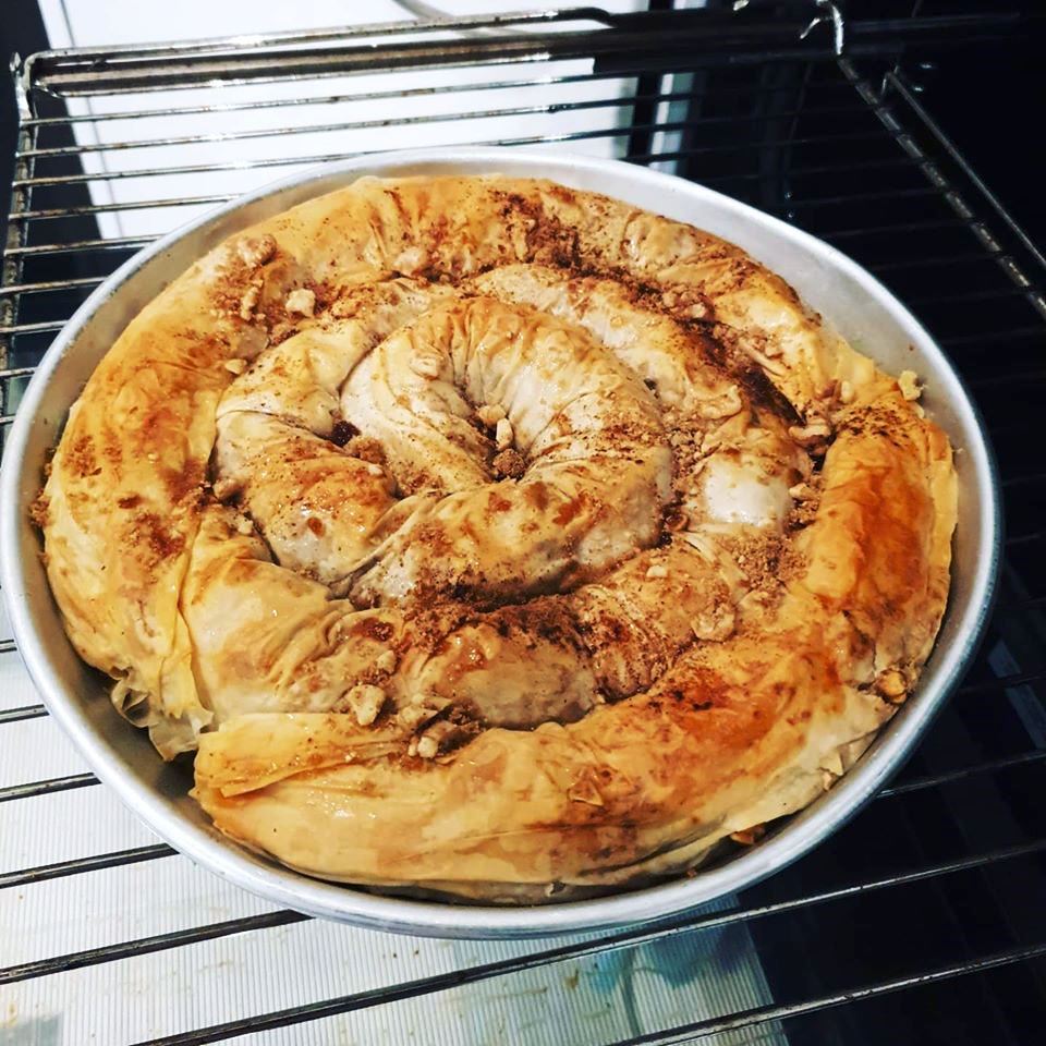 6. Λιώστε επιπλέον βούτυρο και βουρτσίζετε 2 φύλλα μαζί, διασκορπίζετε λίγο από το μείγμα κανέλας / καρυδιού, συμπληρώστε με ένα τρίτο φύλλο φύλλο και βουρτσίζετε με λιωμένο βούτυρο.